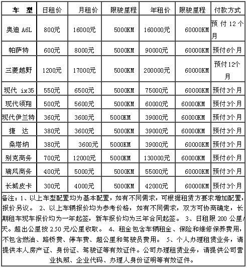 泰安首汽租賃公司租賃車輛報(bào)價(jià)表