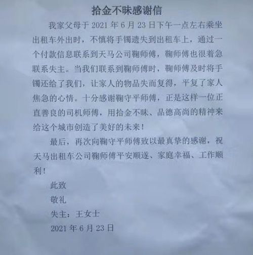 拾金不昧是中華民族的傳統(tǒng)美德,既是主流價(jià)值觀倡導(dǎo)“品德修養(yǎng)·潔身自愛”的人文瑰寶,更是華夏兒女傳承的非物質(zhì)文化遺產(chǎn)。2021年6月23號,一位老人在乘坐我們泰安旅汽天馬出租公司鞠守平師傅的出租車時(shí)不慎將拿去清洗的金手鐲遺落在車上。事發(fā)后,鞠師傅聯(lián)系不上失主,馬上將乘客遺失的物品交回公司,天馬出租公司劉經(jīng)理擔(dān)心失主著急,經(jīng)過多方聯(lián)系以及泰安市交通局出租辦的幫助,終于聯(lián)系上了正在著急的老人,并將物品歸還給失主。失主感動(dòng)不已,說天馬出租的鞠師傅有一顆金子般的心,并委托朋友為鞠師傅送來了感謝信和錦旗。